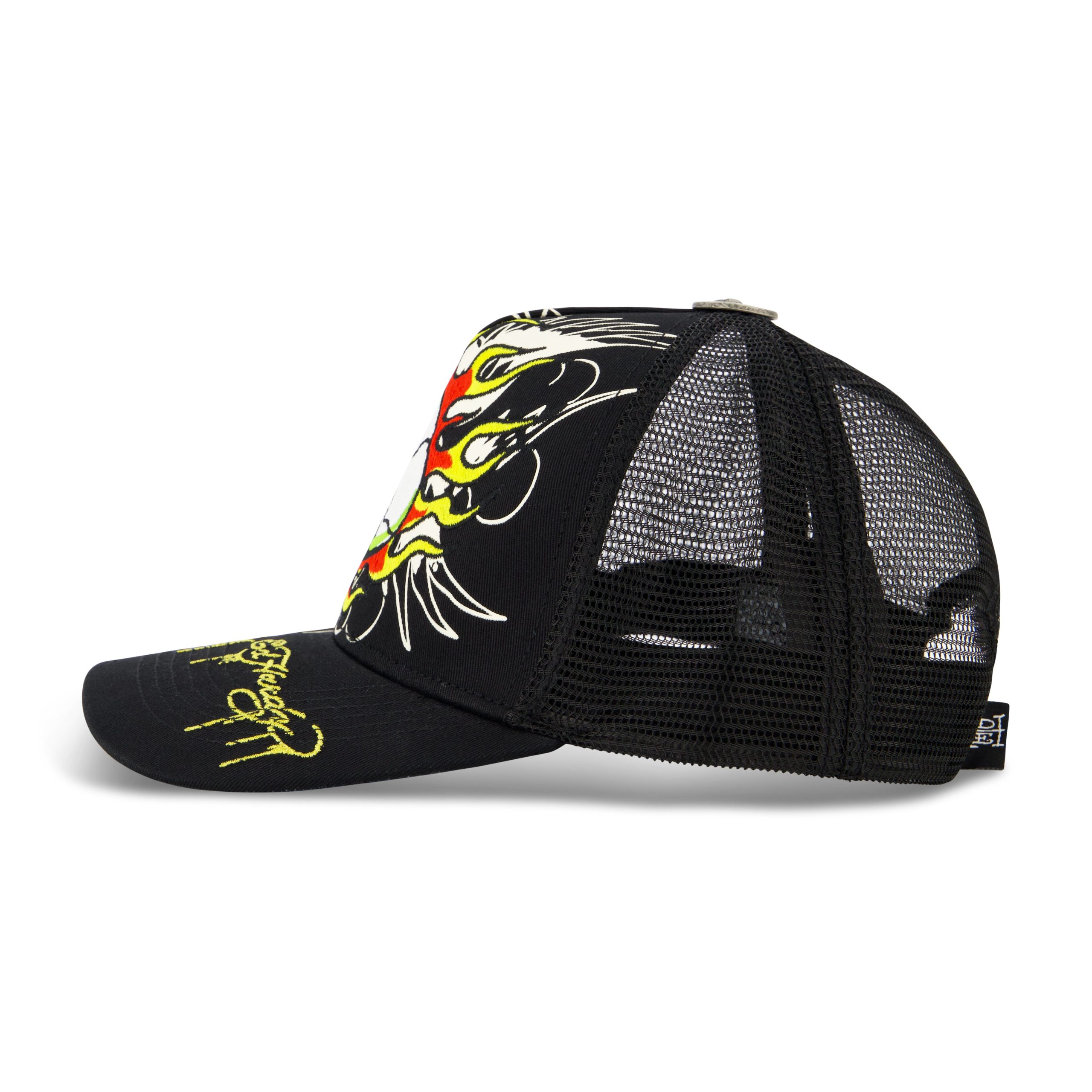 This throwback Ed Hardy trucker hat features an iconic embroidered skull flame graphic. Complete with a mesh snap back and curved brim.