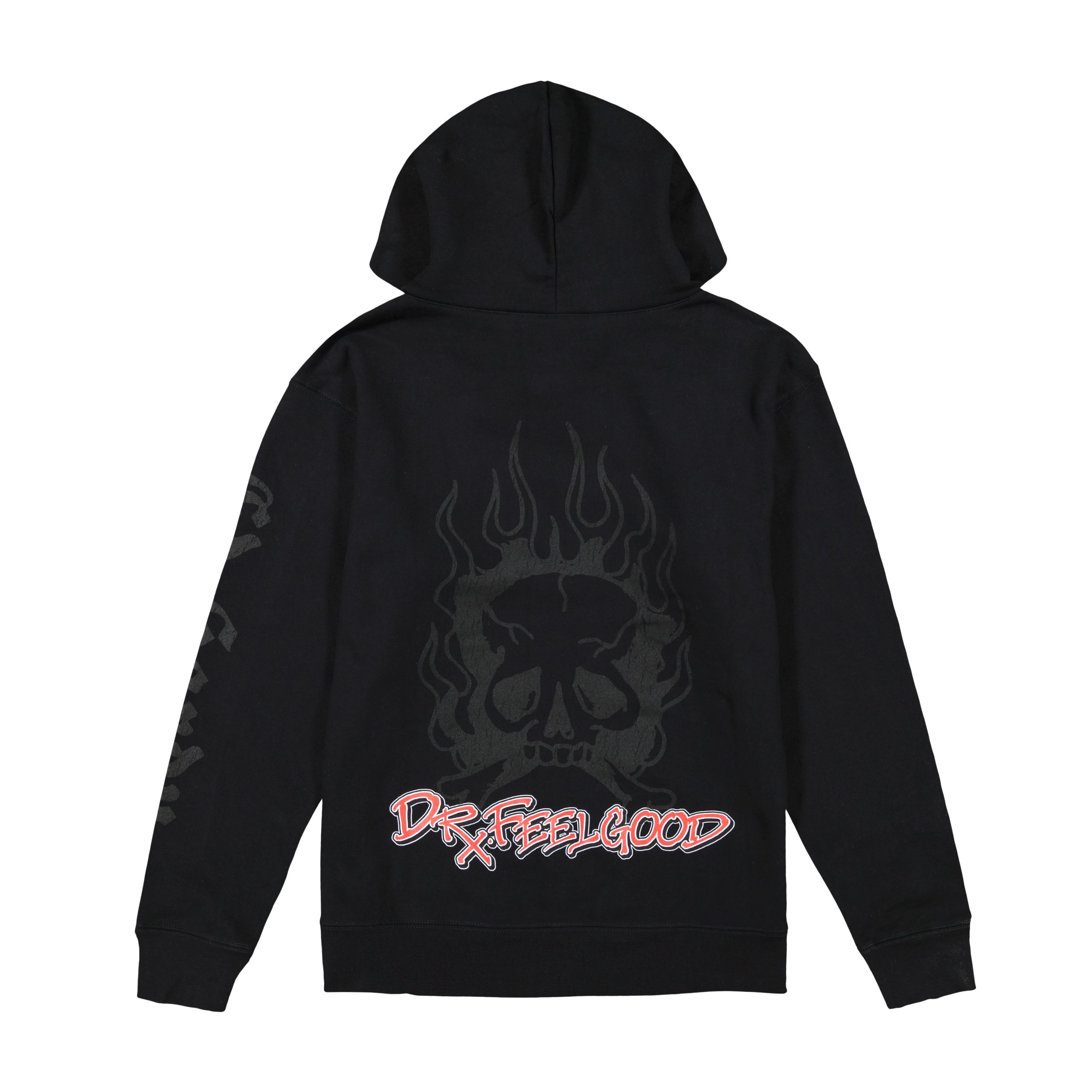 This heavyweight fleece hoodie features an Ed Hardy logo and a Motley Crue Dr. Feel Good graphic.
