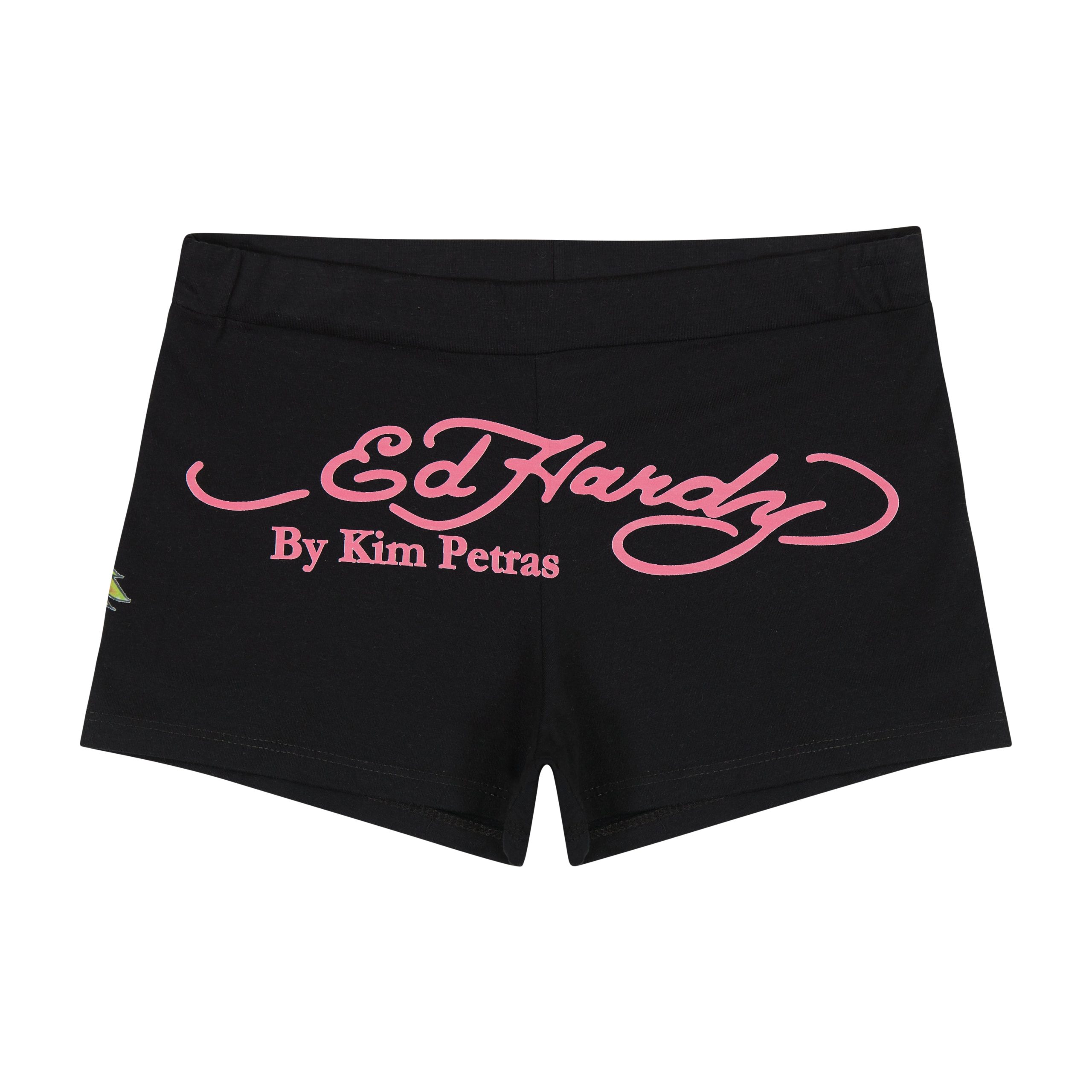 Booty shorts constructed from a cotton-stretch complete with a dragon graphic and ‘Ed Hardy by Kim Petras’ logo. Pair with the Dragon Crop Tube Top to complete your look.