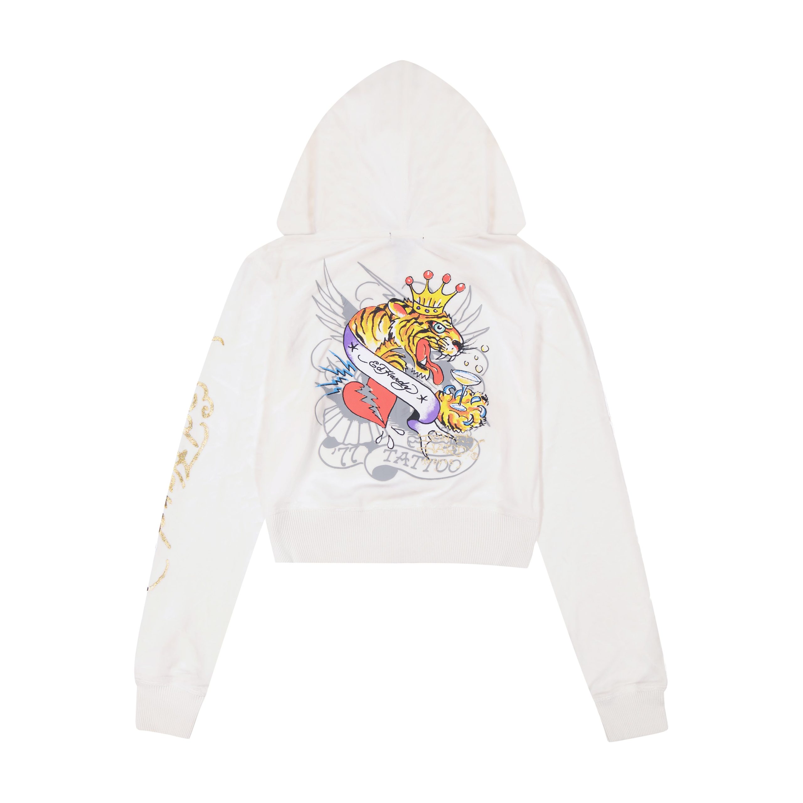 Ed Hardy’s velour sets are a modern twist on the iconic style that reigned in the early 2000’s. This velour cropped hoodie features layers of archival Ed Hardy artwork and logos.